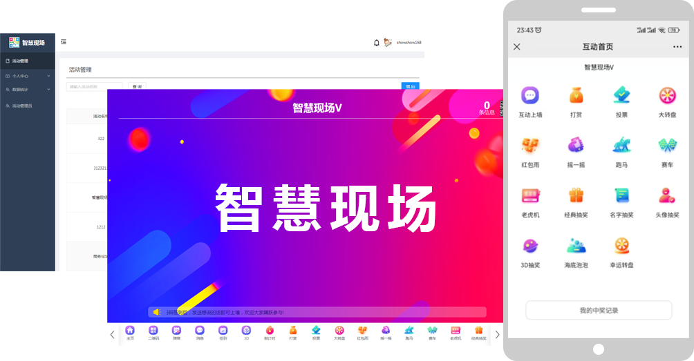 为你提供创新性的会议体验,实现大屏互动、3D签到,消息上墙,在线投票、在线打赏、抢红包、摇一摇,大转盘,跑马,赛车游戏等功能
