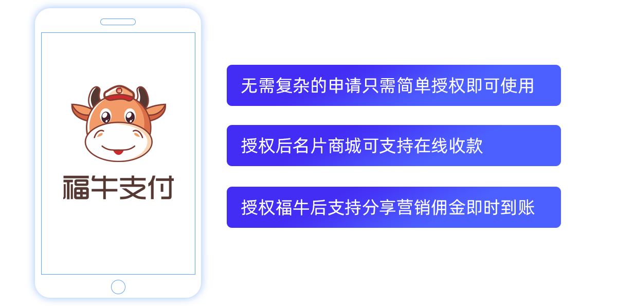 名片只需要在微信一键授权福牛支付,无论是个人名片或是企业名片都可以支持在线支付、在线收款的功能