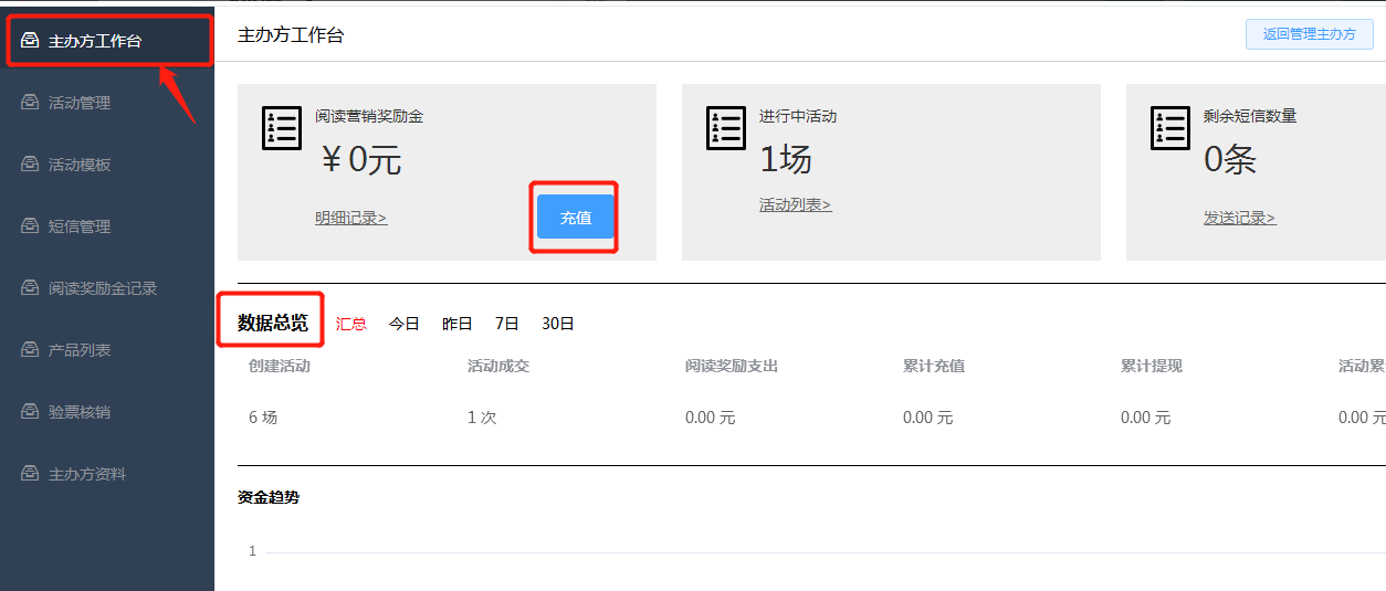 2.4管理:点击管理进入主办方工作台,查看主办方下创建的活动数,浏览数据,以及可以快速充值阅读营销奖励金,短信数量等。如下所示: