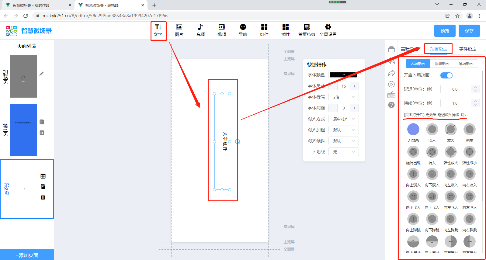 可在右侧针对文字组件编辑,有三个设定:基础设定、动画设定、事件设定。