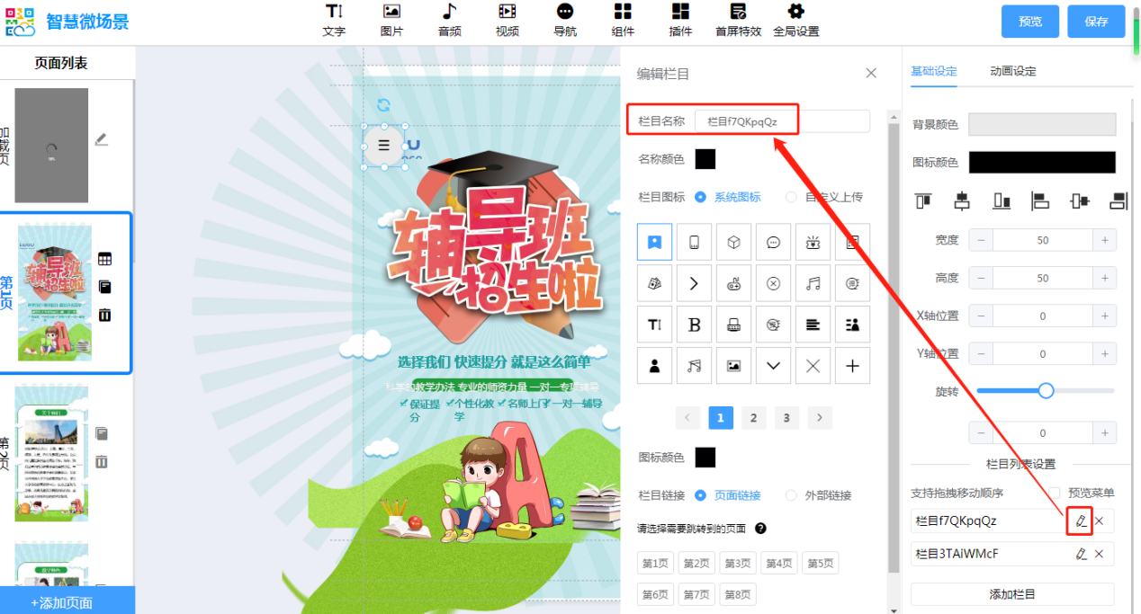 可新增多个栏目,作用为导航导视栏目(针对全页面展示),修改栏目名称后,可对应修改设置的跳转链接。如下图所示: