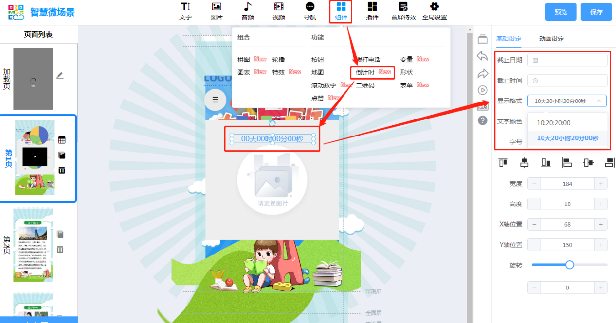 ⑨倒计时组件,在右侧设置截止日期与时间,以倒计时形式呈现