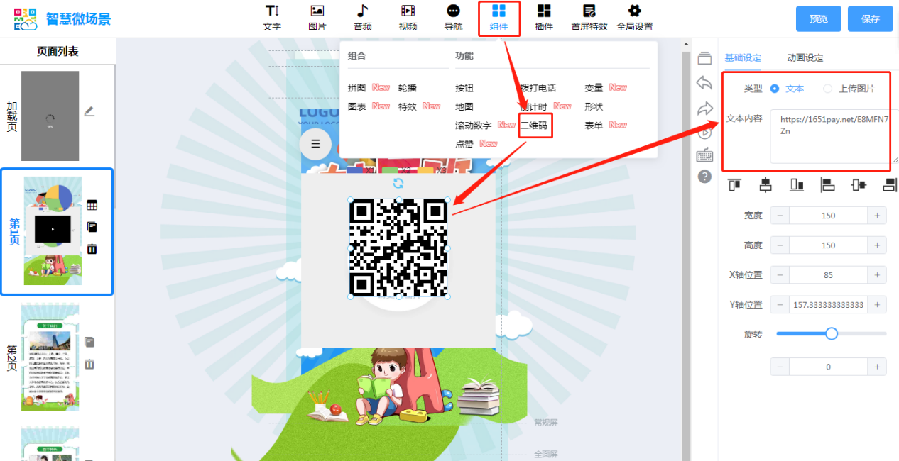 ⑫二维码组件,可通过放入链接转成二维码的形式来植入二维码,也可以直接将已经做好的二维码下载成图片并通过上传图片的形式上传二维码