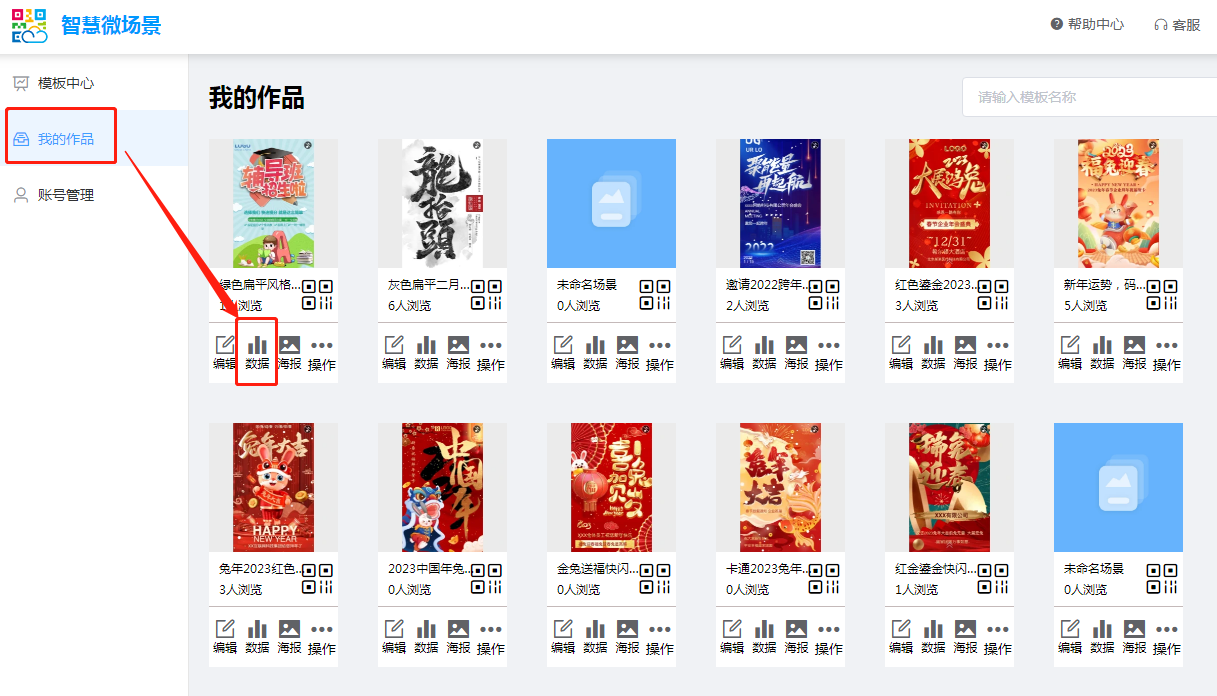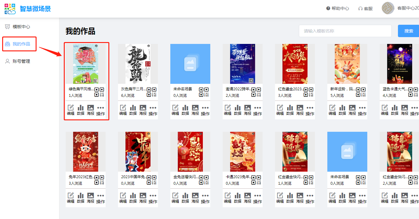 2、在智慧微场景管理页面,点击模板中心,选择或搜索自己想要的模板类型,创建一个新的模板。也可以在右上角搜索模板,找到适合的模板。或者创建一个空白的模板,自己设计也可以。如下图所示: