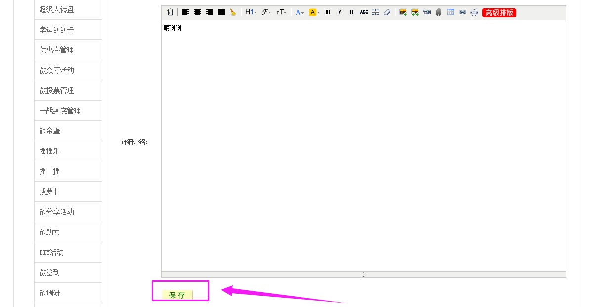 3、点击保存之后,返回众筹活动管理列表,点击“管理”;项目名称按照实际情况填写,请尽量简要,字数在25字以下;副标题按实际情况填写,尽量保持在25字以内;形象图片格式为JPG/PNG,尺寸无要求,大小不超过2MB;简单介绍按实际情况填写,字数在250字以下;起始时间、众筹天数(不能大于活动结束的时间)、目标金额、联系人、联系电话按实际情况填写;项目状态选择启用;详细介绍是对这个项目的详细介绍。最后点击保存即可。如下图所示: