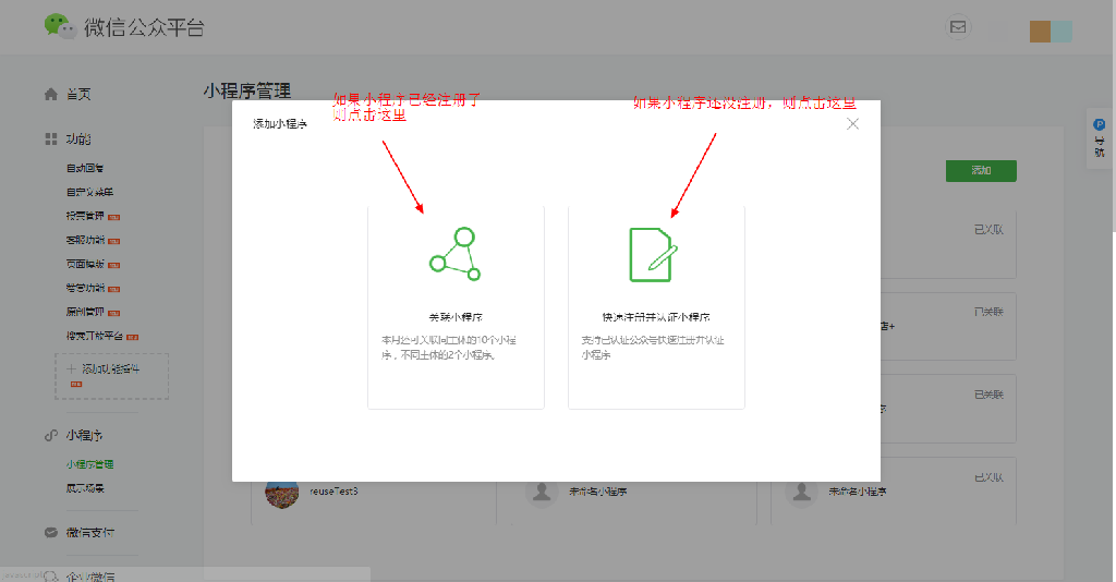 二、如果已经有注册好的小程序,就点击“关联小程序”。如果没有注册好的小程序,就点击“快速注册并认证小程序”。