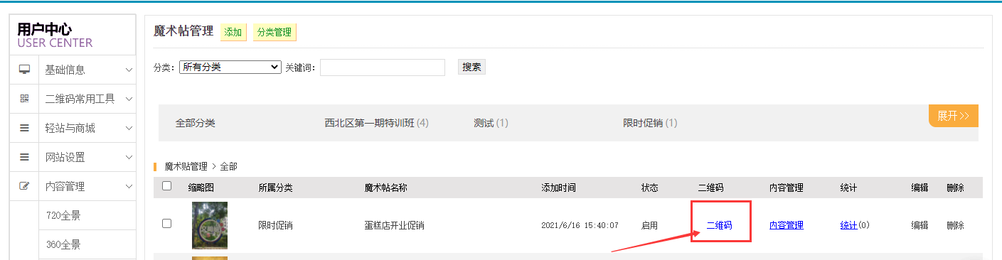 6、多个内容设置完毕后,返回魔术贴管理列表,点击二维码,可扫码体验,或把二维码印在印刷品上均可;点击“统计”如下图所示
