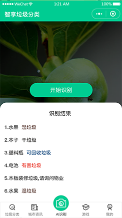 智慧垃圾分类小程序特有的AI识别功能,只需要点开功能就能用摄像头识别垃圾是属于什么分类的,方便进行垃圾投扔