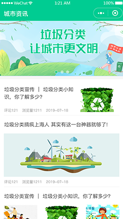 智慧垃圾分类小程序为用户提供所在城市的垃圾分类的资讯、所属小区的垃圾分类动态及公示情况及活动等一系列信息